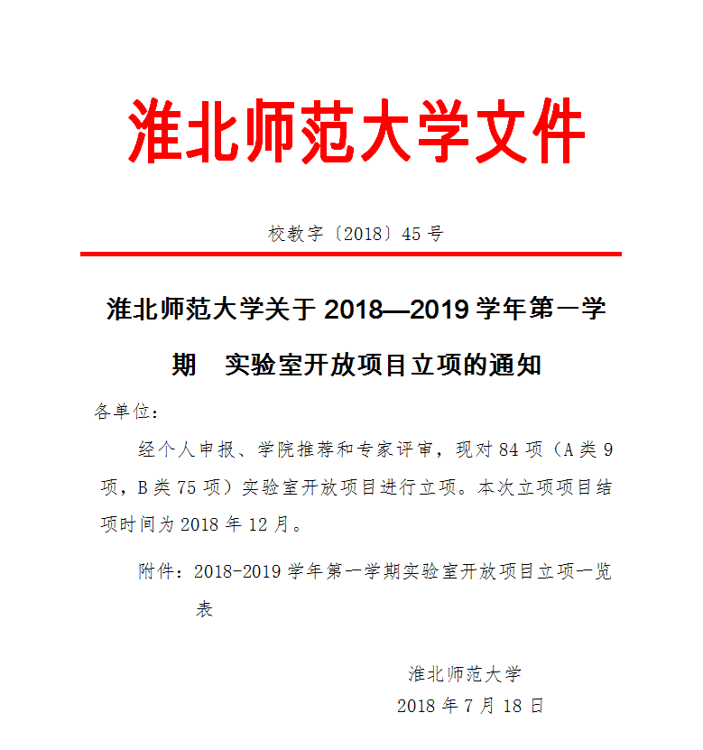 淮北师范大学关于2018-2019第一学期实验室开放项目立项的通知