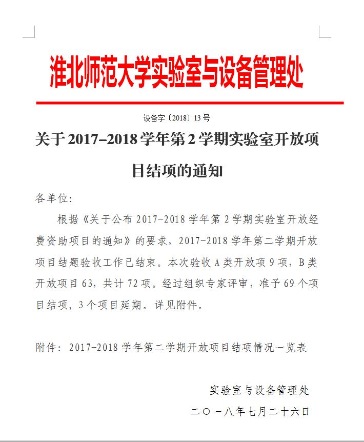 关于2017-2018学年第2学期实验室开放项目结项的通知